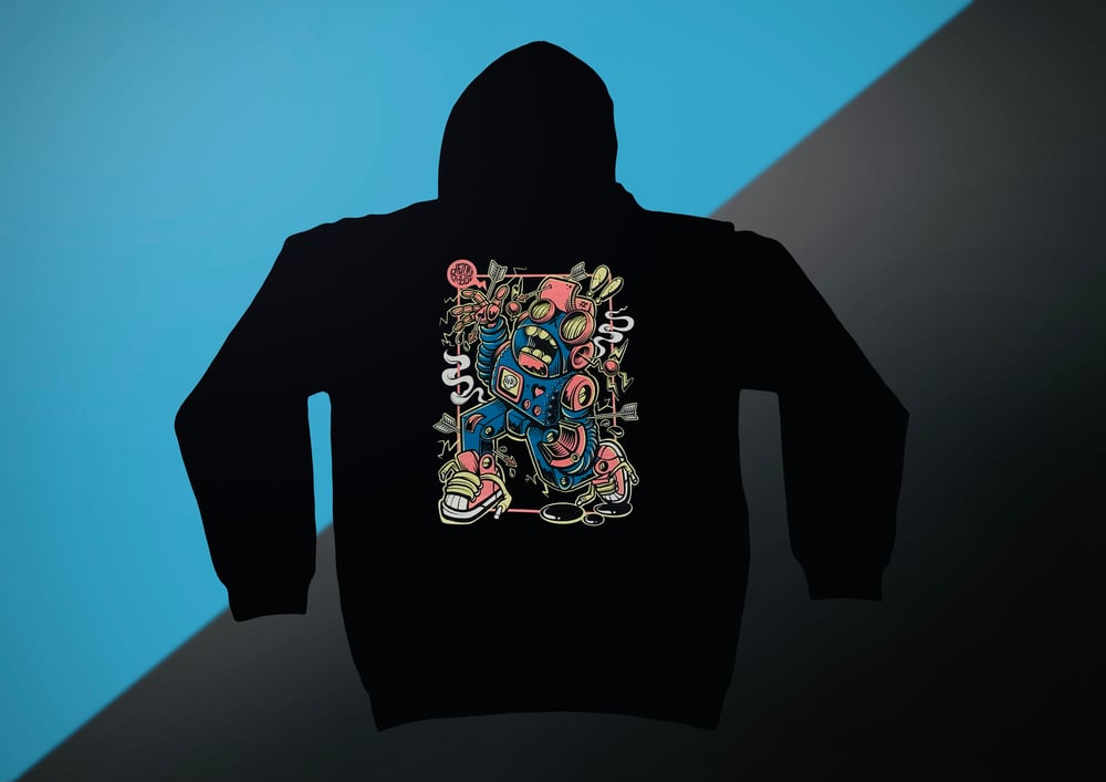 The DFUNKT Fallen Robot hoodie features a large full colour back print and left chest print, using water based, eco-friendly inks at Grey Area Ink Aberdeen.